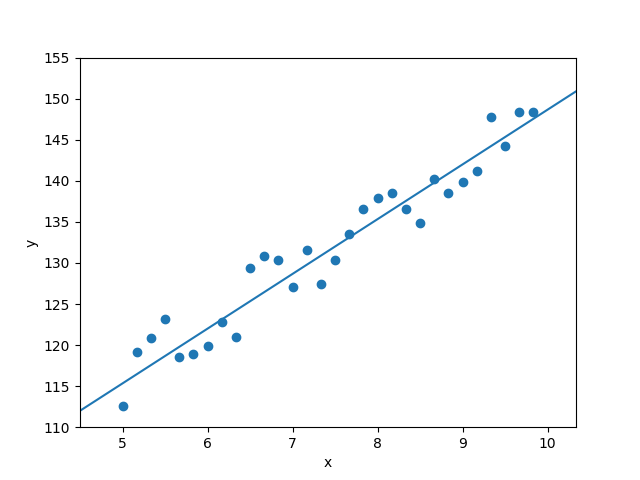 One of the simplest models you can learn is the equation of a line in a two-dimensional space. You can imagine the space as describing two specific aspects of people, for instance, age (on the x-axis) and height (on the y-axis). The graph below shows some data for children aged 5-10, where each point represents a particular child, with their age and height. It highlights that, as a child becomes older, they also grow taller.