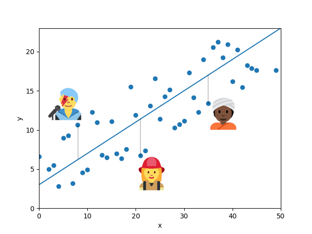 Look at the hypothetical model below. The folks I have highlighted happen to be particularly far from the regression line, compared to other points. But of course, that doesn’t make them less real. They are people who exist out there in the world and embody one the many ways that one can be human.